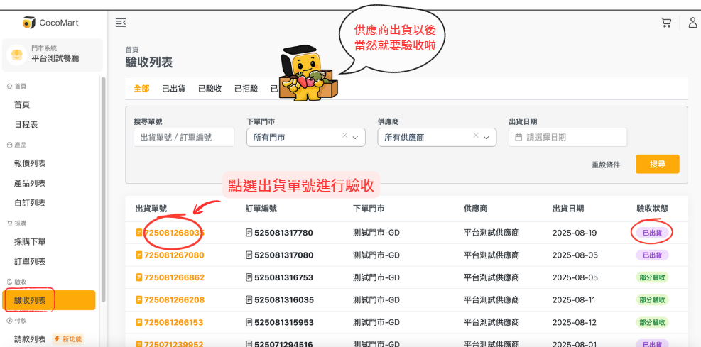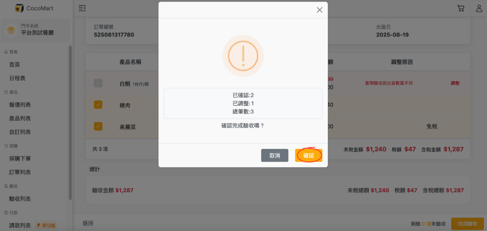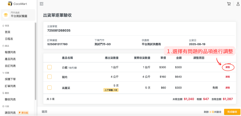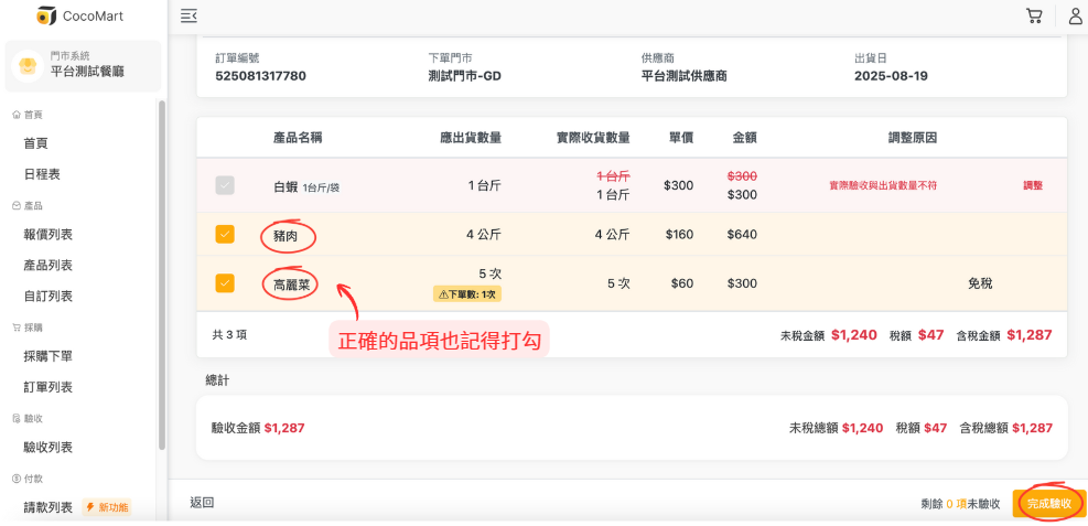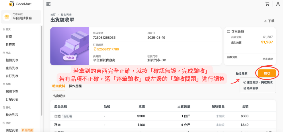 🕓 訂單送出後要去哪裡驗收?驗收數字點錯怎麼辦? ✅ 怎麼驗收?驗收有誤?驗收流程是什麼? 貨品有任何問題,請拍照至群組向供應商反應 驗收數字點選錯誤,請供應商"作廢原出貨單",開出貨單請門市重新驗收 驗收等同結帳,請務必落實驗收動作 📖下一步建議閱讀: 👉🔁 收到的貨有問題,我要如何「退貨」或「換貨」?