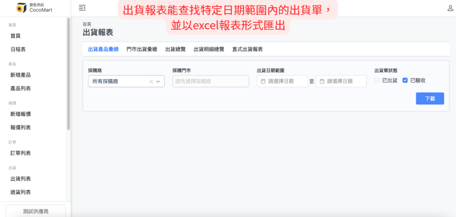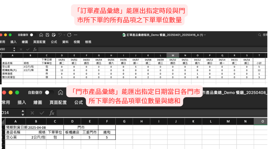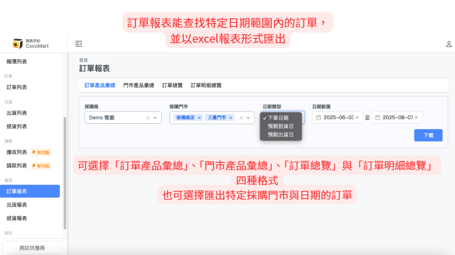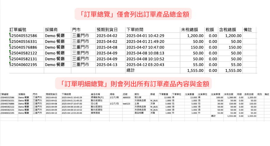 訂單報表:包含所有採購商訂單的品項、數量與金額